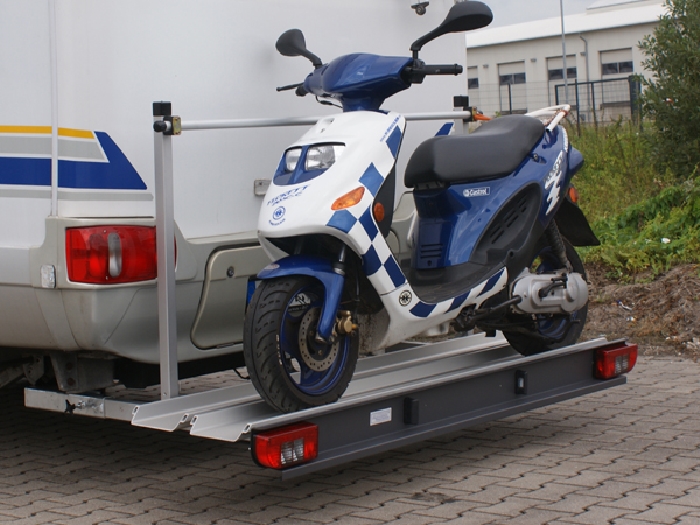 Der ALUTRANS MAXX Rollerträger / Motorradträger- spez. für ihr Wohnmobil, die Komplettlösung für alle Wünsche- mit einer Nutzlast von 135kg, incl. der nötigen Standschiene_ Auffahrschiene, Lichtleiste und Grundrahmen- alles ohne Aufpreis. Der Heckträger ist kpl. aus eloxiertem Aluminium - die Lichtleiste ist zusätzlich pulverbeschichtet, um eine excellente Optik zu bieten. Dieser Heckträger lässt sich mittels Zubehör auch als Fahrradträger, Plattformträger- oder auch als Heckträger mit Staubox umrüsten. Ein Träger für alle Zwecke. Bitte beachten Sie, dass der Heckträger genügend Bodenfreiheit voraussetzt, um ein Aufsetzen des Heckträgers zu vermeiden. Lieferumfang: Kpl. Heckträger für 1 Motorrad/ Rolle, Auffahrschiene, Standschiene Lichtleiste und Heckschutzbügel. Sofern ein Beleuchtungsanschluss nicht bereits am Reisemobil vorhanden ist- diesen bitte ggf. separat mitbestellen. Durch die Fahrzeugadapter/ Aufnahmeelemente kann dieser Heckträger auch sehr schnell und einfach innerhalb 20sec. bei Nichtbedarf abgenommen werden. Sofern das Fahrzeug über keine Heckträgeraufnahmen verfügt, sind diese separat zu bestellen. Gewicht des Trägers ohne Aufnahmeelemente ca. 37 kg. (Die Lichtleiste kann optisch abweichen, da diese stets in aktuellster Ausführung geliefert werden.) Fordern Sie unser Prospekt zum Heckträger MAXX in Papierform an. Um den Roller oder ein Motorrad auf dem Heckträger einfach und sicher zu befestigen, bieten wir Ihnen als Zubehör das enstprechende Befestigungskit (bitte separat bestellen) gern mit an. Lassen Sie sich von uns beraten.