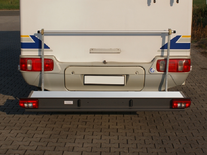 Alle Möglichkeiten--Die Aluminiumplattform, kpl. incl. dem nötigen Grundträger prestige ist die ideale Lösung für alle, die Lasten bis 150kg mit Ihrem Wohnmobil mitnehmen wollen. Der Plattform sind 4 stabile Zugösen beigefügt, die helfen, um das Ladungsgut dauerhaft sichern zu können. Der Grundträger und die Lichtleiste sind verzinkt-die Lichtleiste ist zusätzlich schwarz pulverbeschichtet, um eine fast unbegrenzte Lebensdauer und erstklassige Optik zu bieten- die Alu-Plattform ist in Sandwich- Bauweise mit Holz Innenkern gefertigt- die Oberfläche aus eloxiertem Riffel- Aluminium-mit umlaufender Aluschiene. Abmessungen der Plattform ca. 1800x 400 mm: Gewicht des Trägers ohne Aufnahmeelemente (auch nicht im Lieferumfang enthalten) ca. 37 kg.. Lieferumfang: Kpl. Heckträger incl. Plattform, incl. Beleuchtung. -ähnlich Abbildung.- (Die Lichtleiste und Plattform kann optisch abweichen, da diese stets in aktuellster Ausführung geliefert werden.) TüV- eintragungsfrei. Gern beraten wir Sie.
