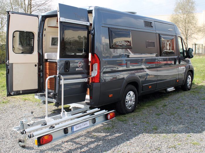 Schwenkbarer und hochklappbarer Fahrradträger für E- Bike, Fahrräder und Heckbox. Dieser erlaubt bei dem Mercedes Sprinter (bis max. 5,93m Fahrzeuglänge, max. Überhang 1,24m) 4er Bj. 2006-2018 ohne AHK, auch beladen das Öffnen der Hecktüren. Ohne Ladung kann dieser praktisch hochgeklappt werden- somit verringert sich die Fahrzeuglänge unbeladen. Da dieser Träger am Chassis befestigt wird, kann der Swing Carry ohne Anhängerkupplung verwendet werden. Kombinierbar ist der Swing Carry mit der verzinkten Anhängerkupplung der Hersteller BOSStowbars und GALIA. Der Fahrradträger ist innerhalb weniger Sekunden vom Fahrzeug abgenommen, so dass die AHK wahlweise genutzt werden kann. Der Swing Carry hat eine Nutzlast von ca. 80kg und ein Eigengewicht von ca. 50kg. Der SMV Swing Carry ist verzinkt und aus Aluminium gefertigt. Ein 1a Produkt Preis Leistung -TÜV-EINTRAGUNGSFREI-. Wir bitten Sie vorab zur Überprüfung einige Abbildungen vom Unterbau des Fahrzeuges und eine Kopie des Fahrzeugscheins per Mail an uns zu übersenden. Gern senden wir Ihnen weitere Informationen. Zubehör (auf Wunsch separat zu bestellen): Diebstahlsicherung zur Sicherung des Fahrradträgers am Wohnmobil/ Kastenfahrzeug, Artikelnr: 2887497.