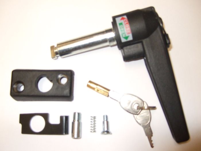 Reparatursatz für abnehmbares Hebelsystem C des Herstellers umbra rimorchi. Lieferumfang: Verschlusshebel, Schloss, Sicherungsplatte, Schrauben, Feder.